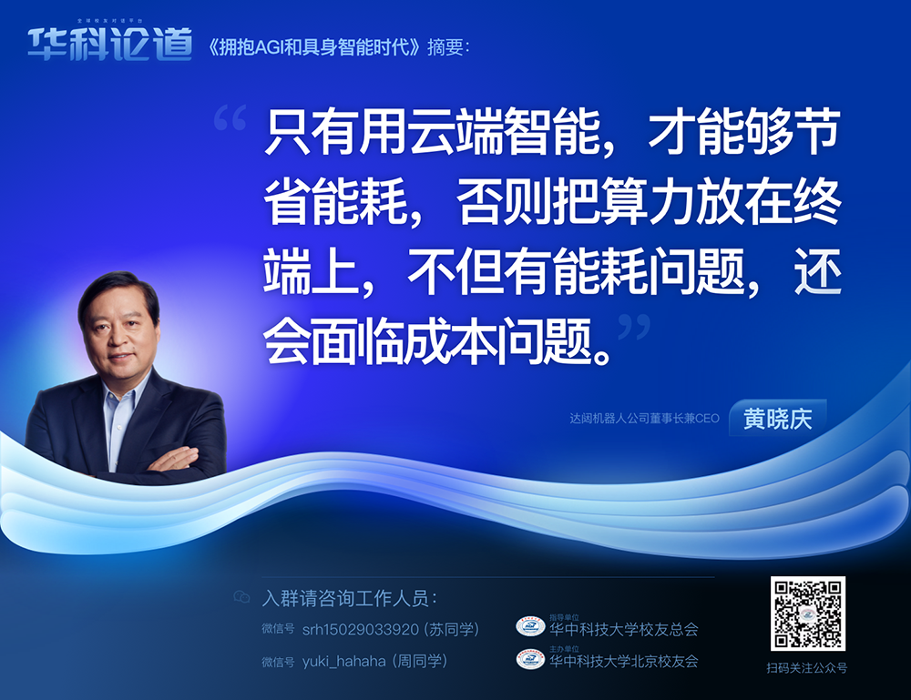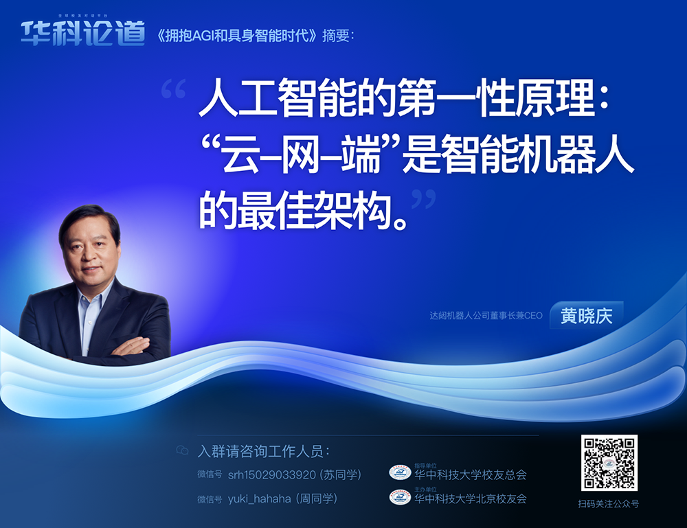 1月30日,在第五十五期「華科論道」上,由華中科技大學(xué)北京校友會(huì)主辦的活動(dòng)迎來(lái)了一位特別嘉賓——達(dá)闥機(jī)器人公司董事長(zhǎng)兼CEO黃曉慶先生,他帶來(lái)了「擁抱AGI和具身智能時(shí)代」的主題演講,為廣大校友帶來(lái)了精彩紛呈的分享。