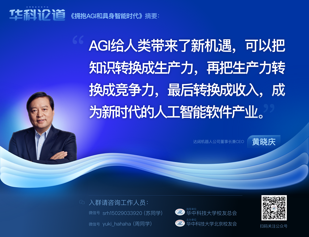 作為華中科技大學(xué)傑出校友及全球人工智能領(lǐng)域的前沿技術(shù)專家,黃曉慶先生結(jié)合自己多年在機(jī)器人行業(yè)的深入研究和實(shí)踐經(jīng)驗(yàn),分享了對(duì)於通用人工智能(AGI)發(fā)展趨勢(shì)及其對(duì)各行各業(yè)影響的洞見。他認(rèn)為,AGI將成為新時(shí)代軟件產(chǎn)業(yè)轉(zhuǎn)化知識(shí)、生產(chǎn)力、競(jìng)爭(zhēng)力乃至收入的關(guān)鍵驅(qū)動(dòng)力,以下是他的主要觀點(diǎn)和演講中的「金句」: