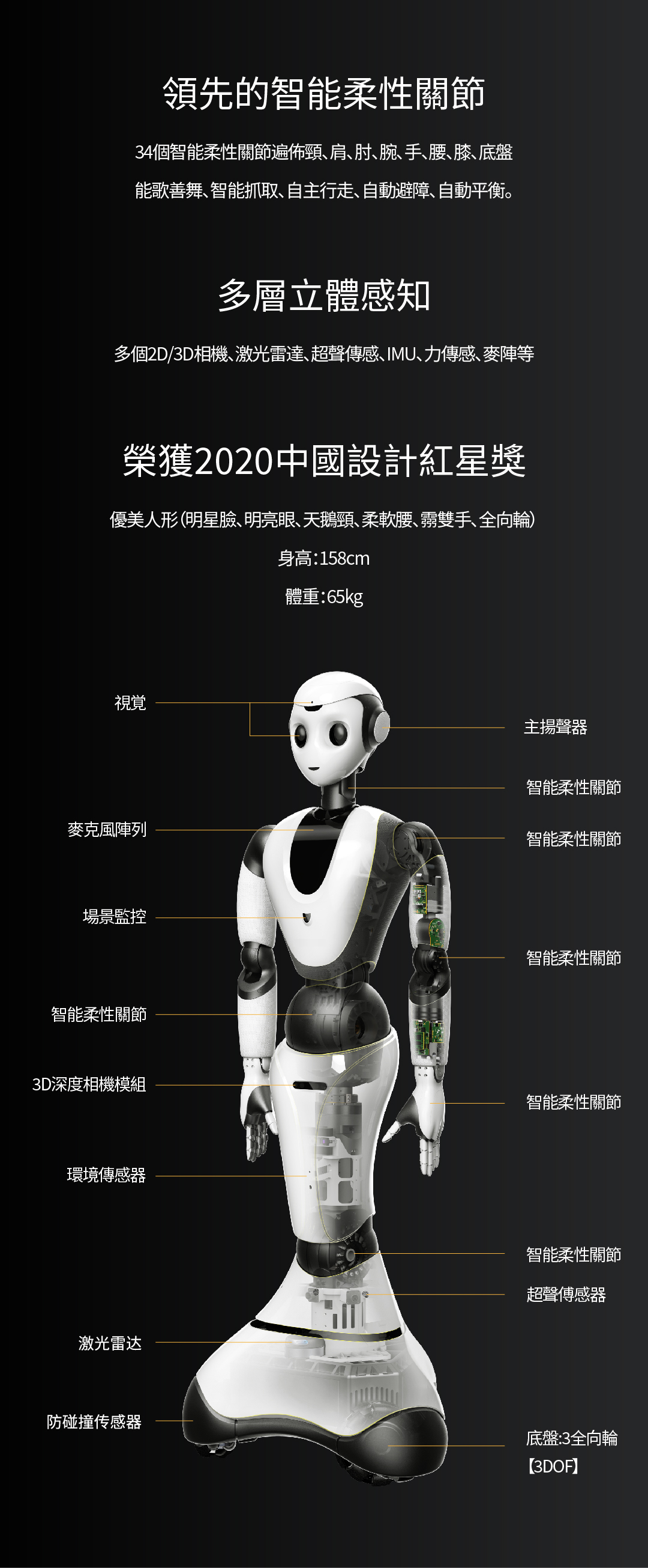 34個(gè)智能柔性關(guān)節(jié)遍布頸、肩、肘、腕、手、腰、膝、底盤