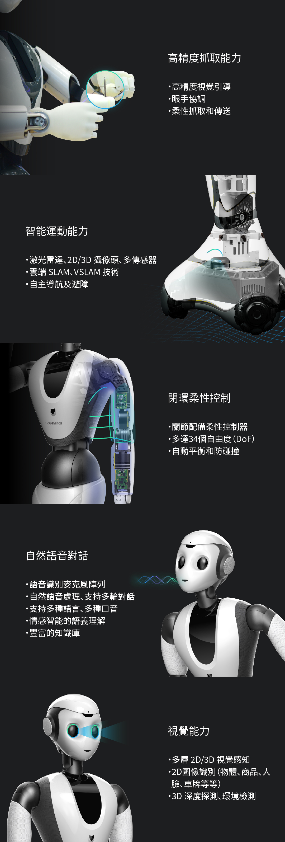 精準(zhǔn)的視覺抓取能力、全方位的聽、說、看、動(dòng)等融合智能能力。