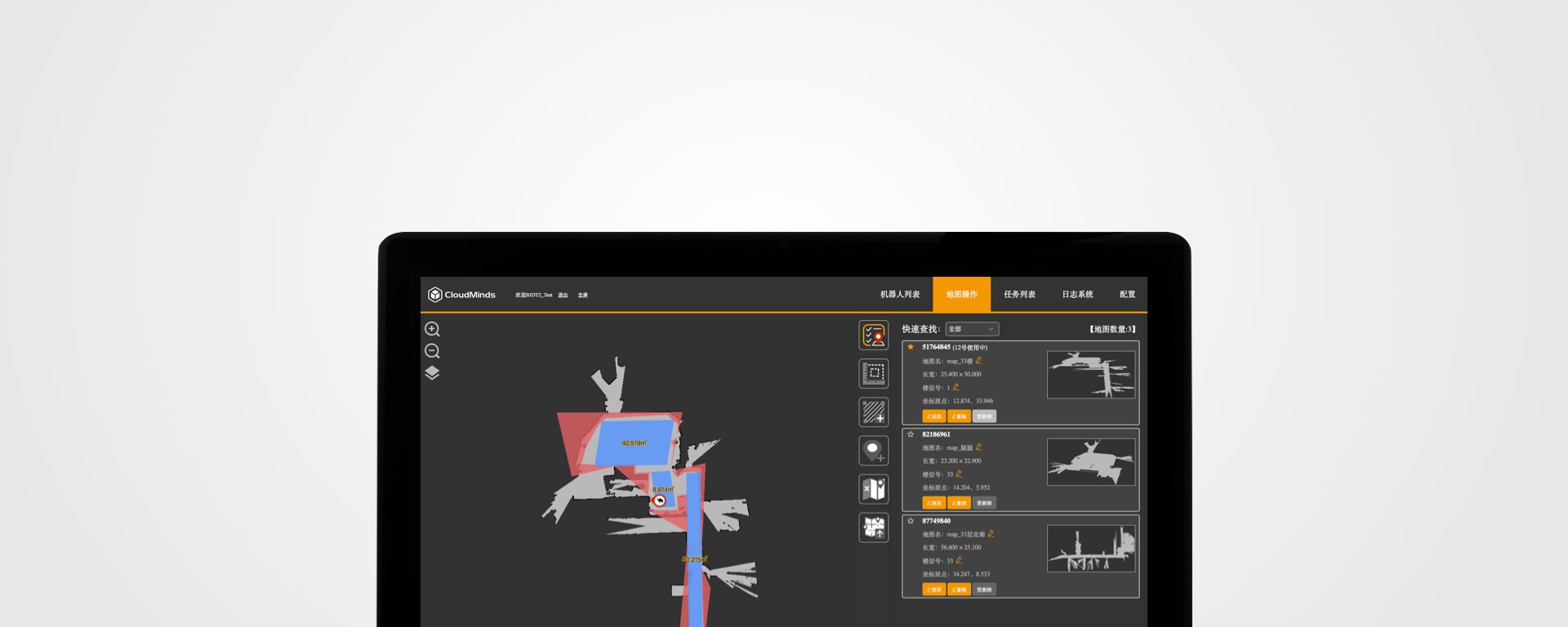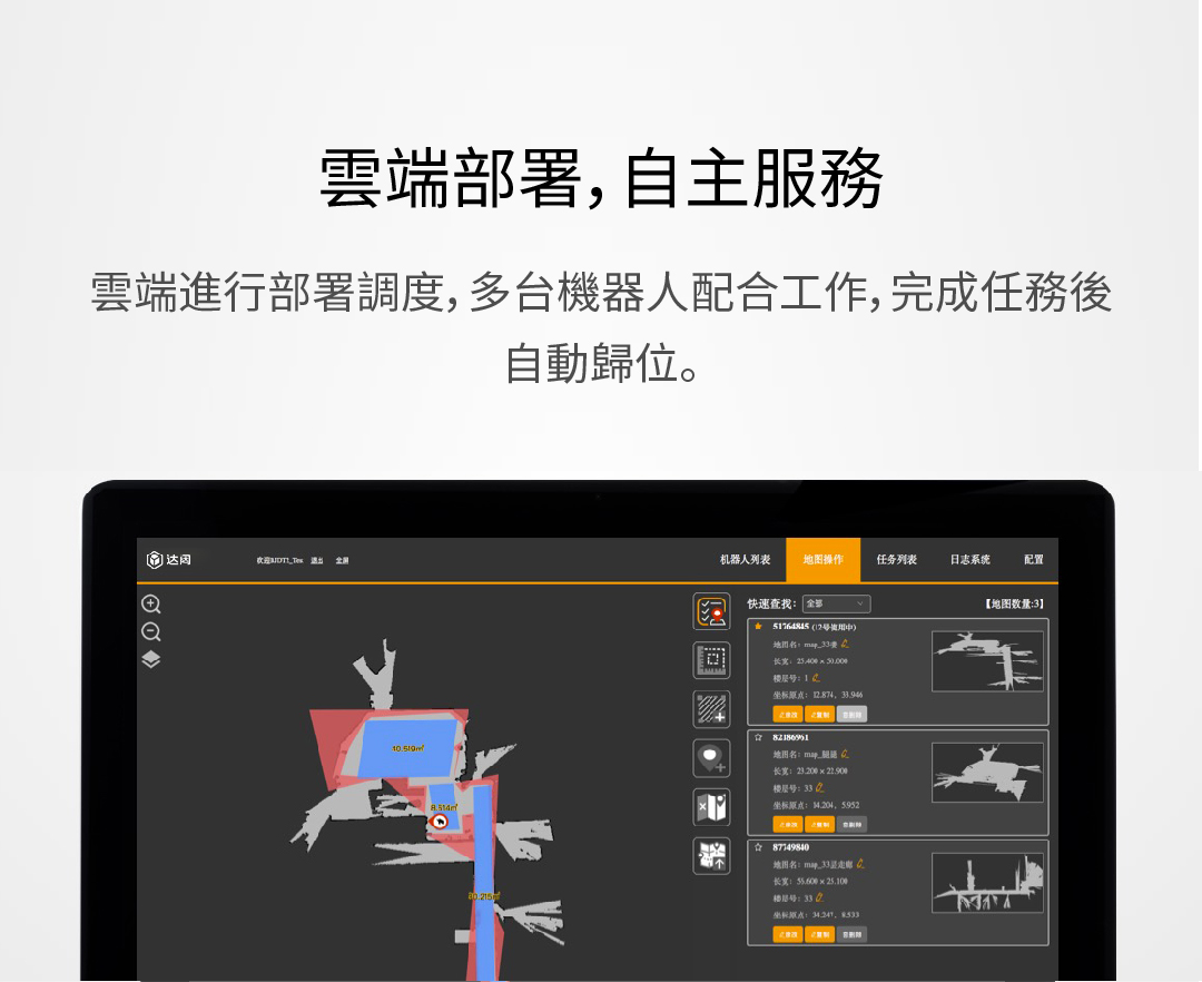 雲(yún)端進行部署調(diào)度,多臺機器人配合工作,完成任務後自動歸位。