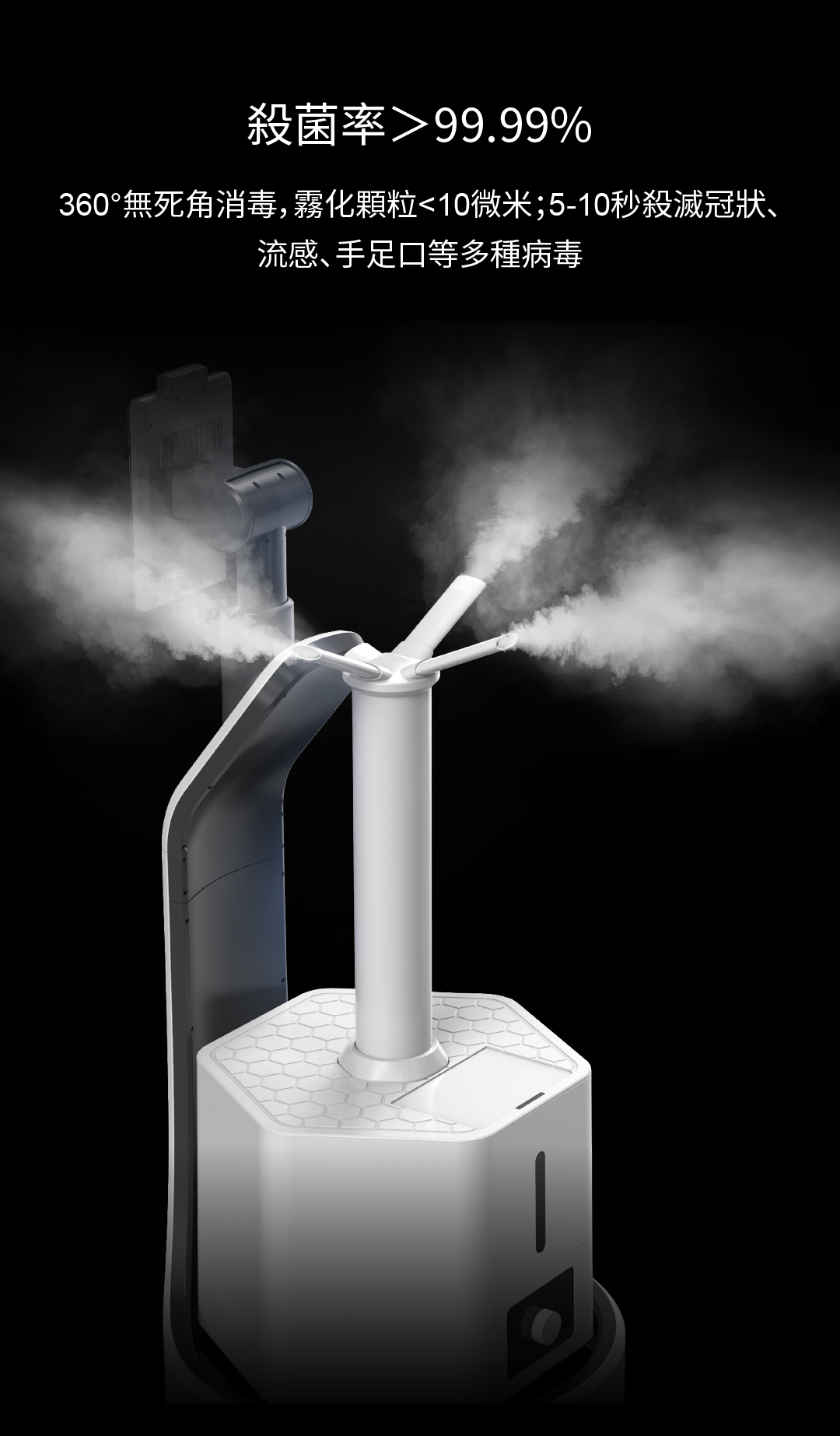 360°無(wú)死角消毒,霧化顆粒<10微米;5-10秒殺滅冠狀、流感、手足口等多種病毒