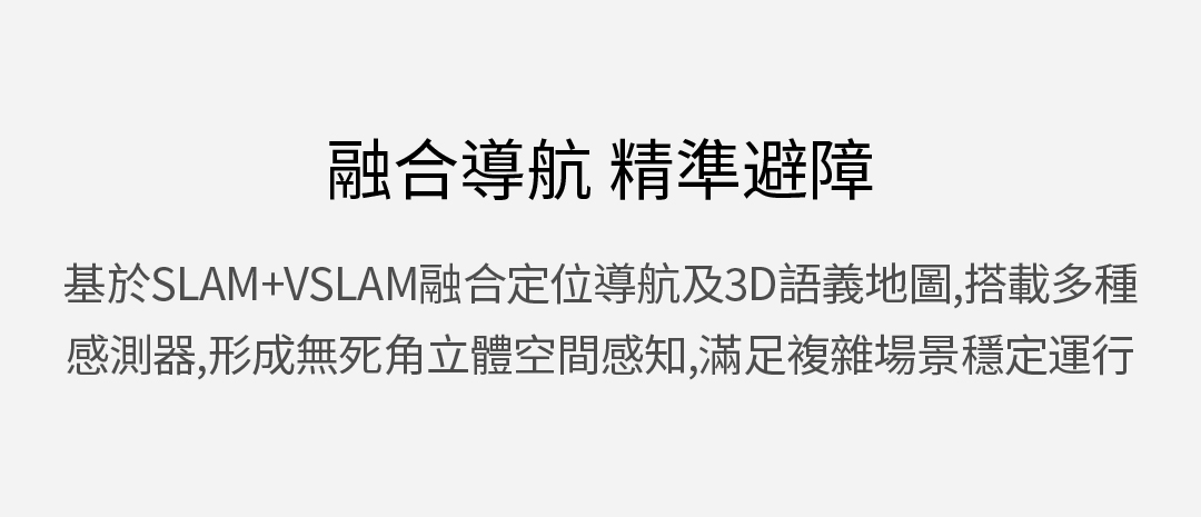 基於SLAM+VSLAM融合定位導(dǎo)航及3D語(yǔ)義地圖,搭載多種感測(cè)器,形成無(wú)死角立體空間感知,滿(mǎn)足複雜場(chǎng)景穩(wěn)定運(yùn)行