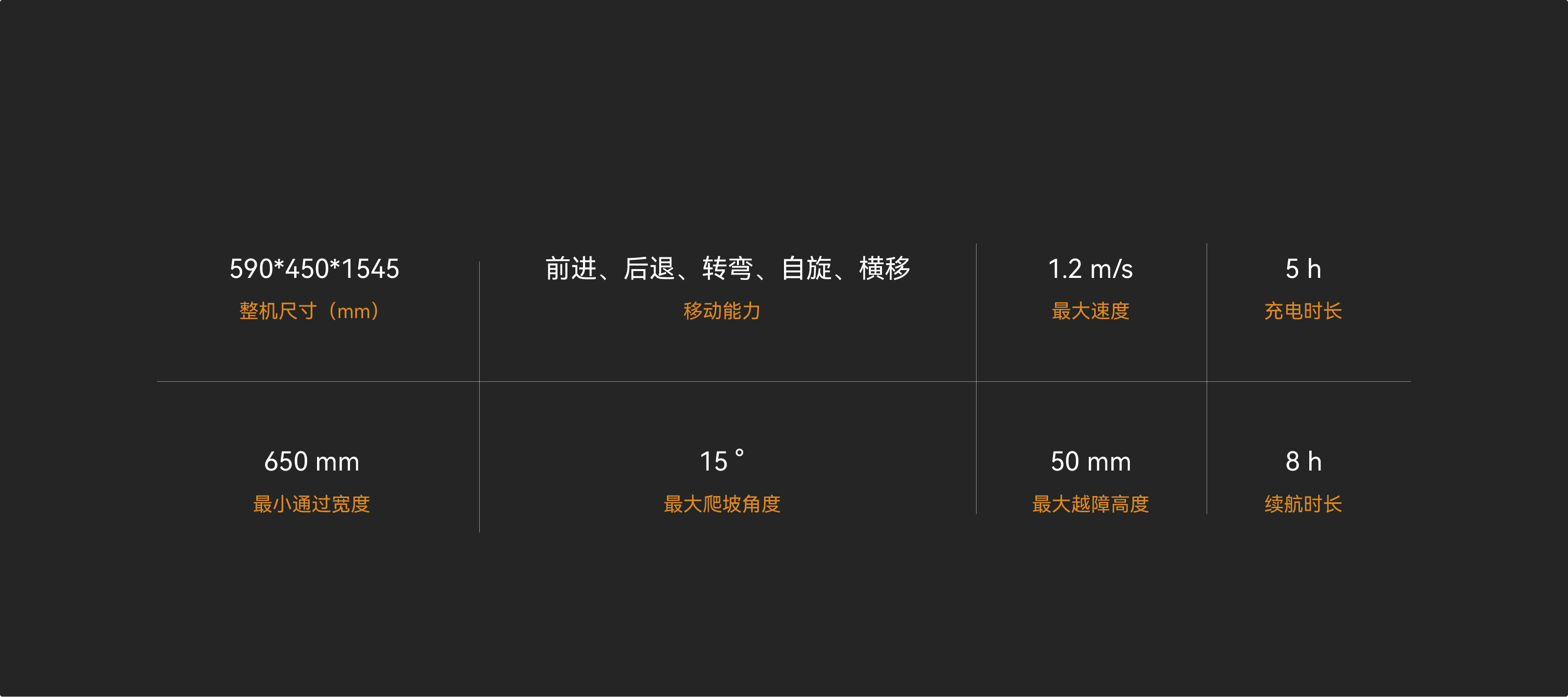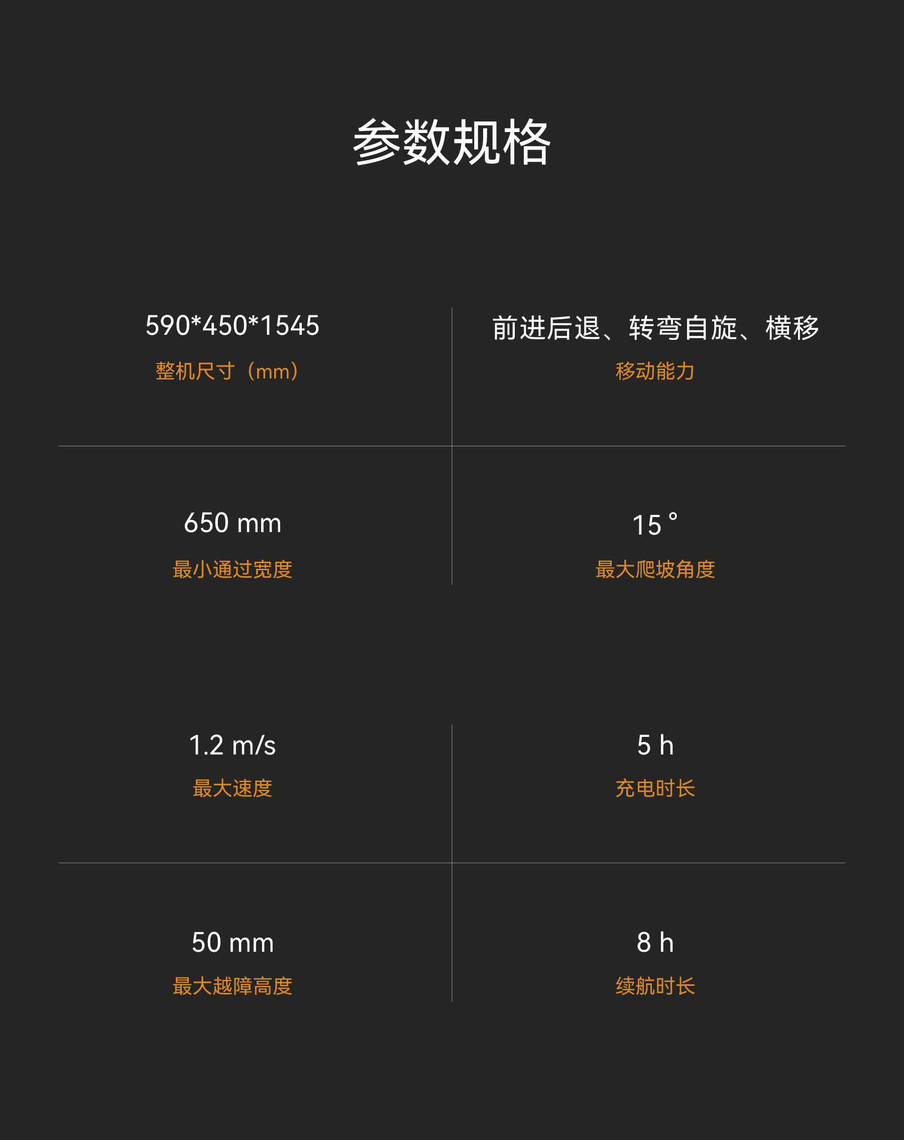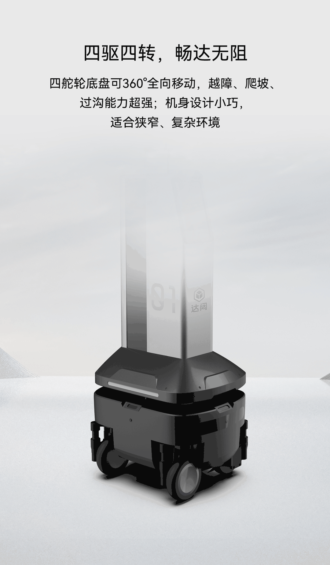四舵輪底盤可360°全向移動(dòng),越障、爬坡、過溝能力超強(qiáng);機(jī)身設(shè)計(jì)小巧,適合狹窄、復(fù)雜環(huán)境