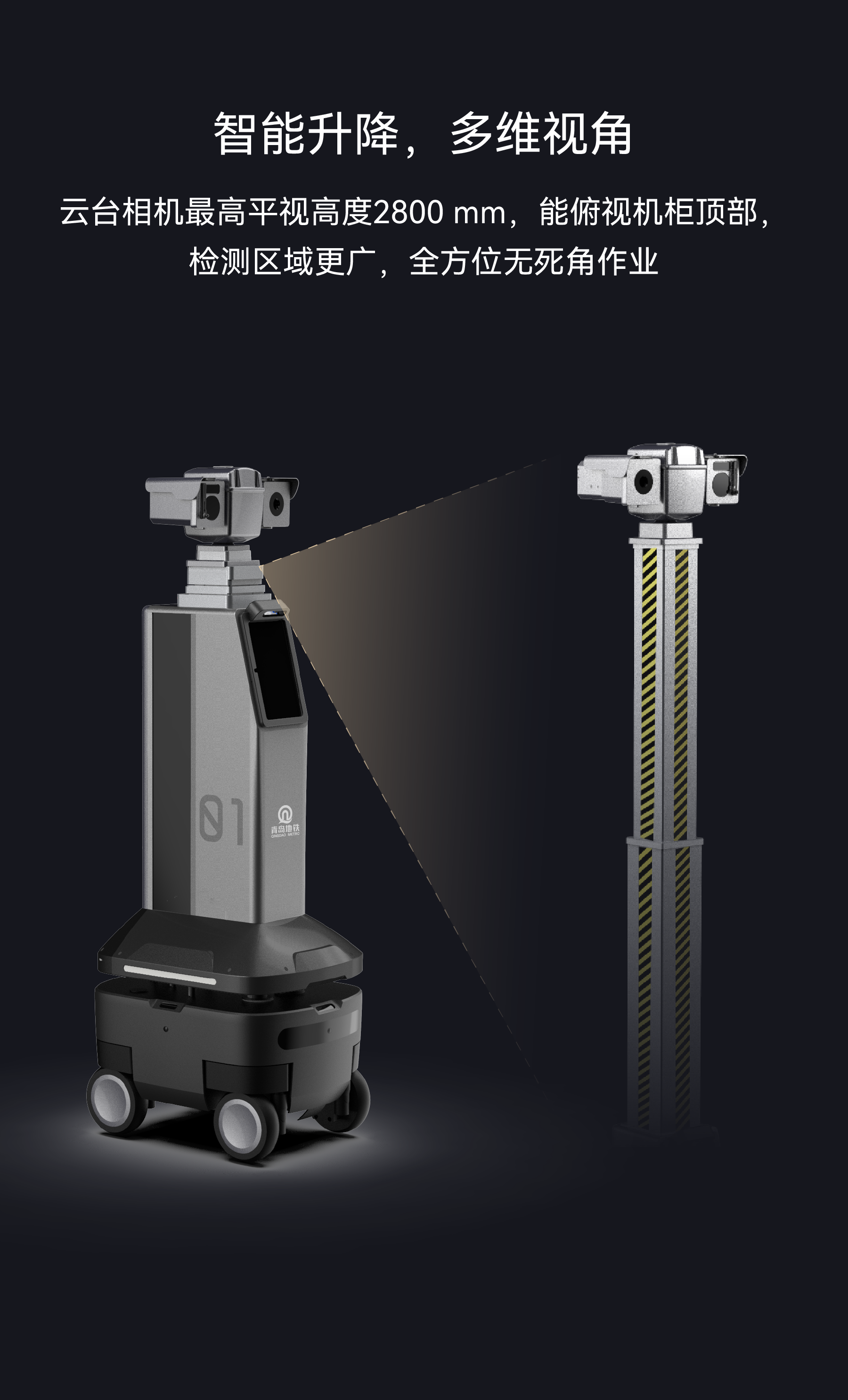 云臺(tái)相機(jī)最高平視高度2800 mm,能俯視機(jī)柜頂部,檢測區(qū)域更廣,全方位無死角作業(yè)