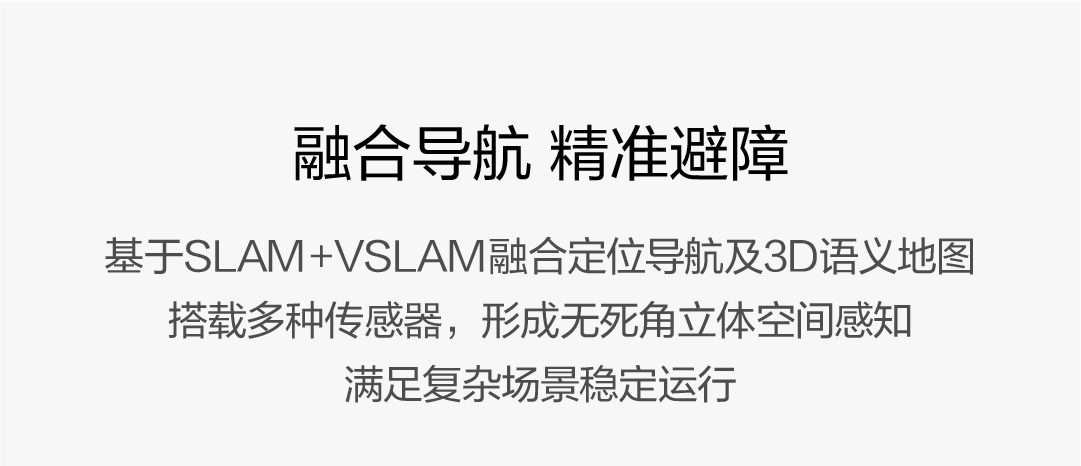 基于SLAM+VSLAM融合定位導(dǎo)航及3D語(yǔ)義地圖,搭載多種傳感器,形成無(wú)死角立體空間感知,滿足復(fù)雜場(chǎng)景穩(wěn)定運(yùn)行