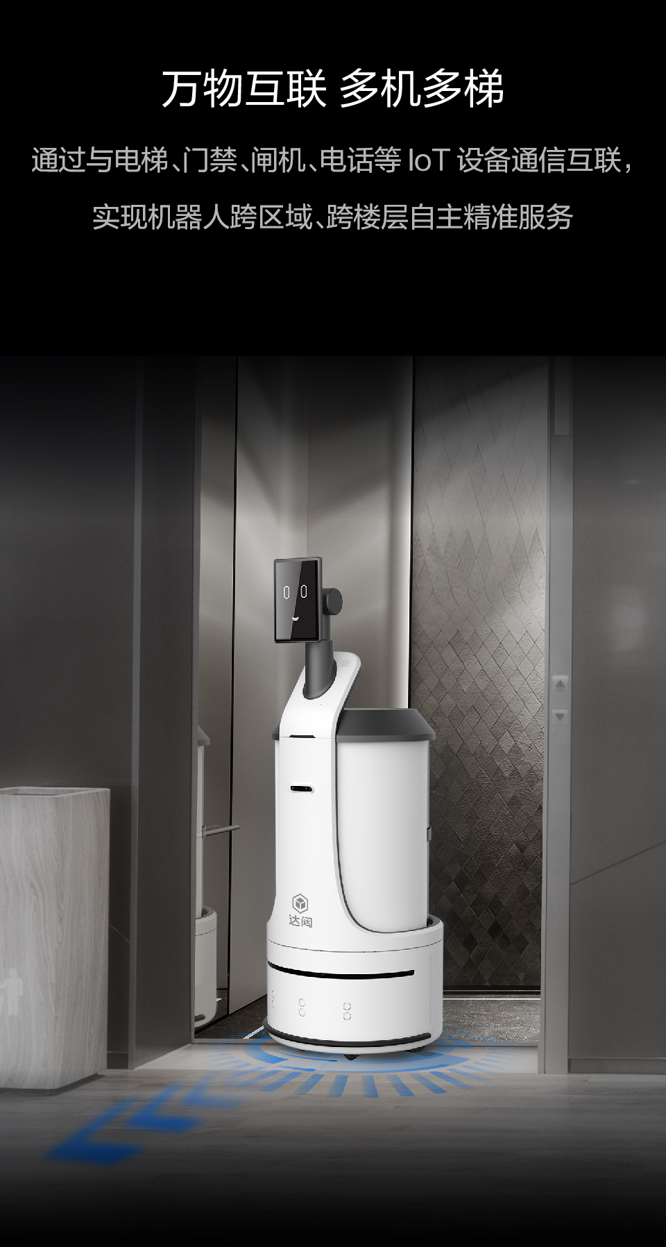 通過(guò)與電梯、門(mén)禁、閘機(jī)、電話等IoT設(shè)備通信互聯(lián),實(shí)現(xiàn)機(jī)器人跨區(qū)域、跨樓層自主精準(zhǔn)服務(wù)